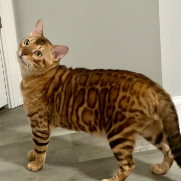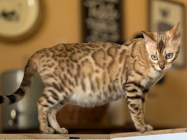 A base coat of a brown Bengal cat will be lighter than the dark contrasts of their markings and carry many different shades. Their tails are usually solid black-tipped, and they have bright green or golden-colored eyes. This is the coloring of a Bengal most closely connected to the leopard, as it is very similar to their wild ancestors.